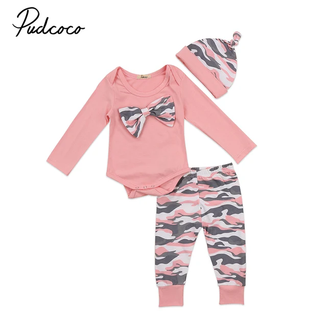 Us 5 81 13 Off Cute Newborn Baby Girl Clothes Pink Long Sleeve Bow Romper Tops Camo Pant Trouser Hat 3pcs Outfits Toddler Kids Clothing Set In
