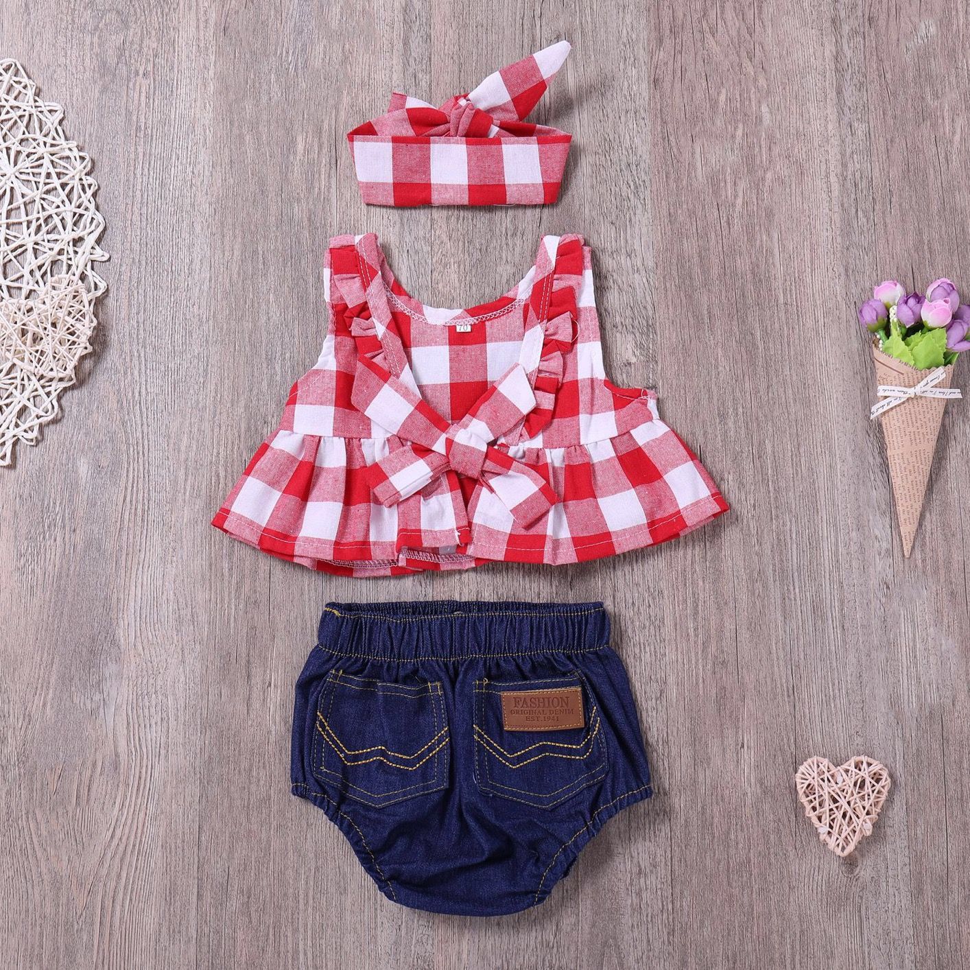 2019 Ins Stylish Newborn Girls Off Should Red Stripes Plaid Tops Denim Bloomers With Headbands Suits Lovely Baby Girls Outfits For 0 2t From Rsggroup