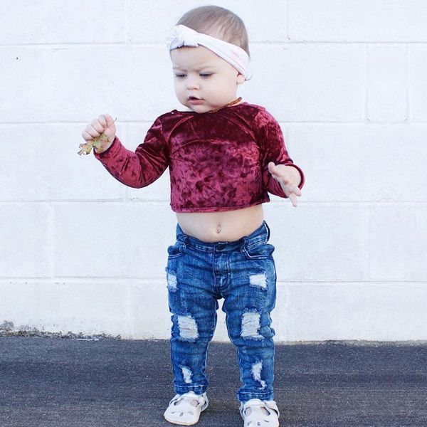 2019 Baby Girl Clothes 2018 New Fashion Newborn Baby Girls Velvet Pleuche Wine Red Long Sleeve Crop Tops T Shirt Children Clothing Autumn Winter From