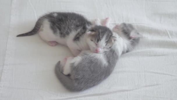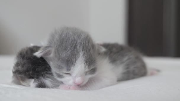 Lifestyle Funny Video Two Cute Newborn Kittens Sleep Teamwork On The Bed Pets Concept Pets Concept Little Cats Striped Sleep On A White Background
