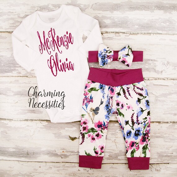 Personalized Newborn Girl Outfit Fall Winter Baby Girl Coming Home Outfit Toddler Girl Clothes 3 6 9 12 18 Months Burgundy Watercolor Floral