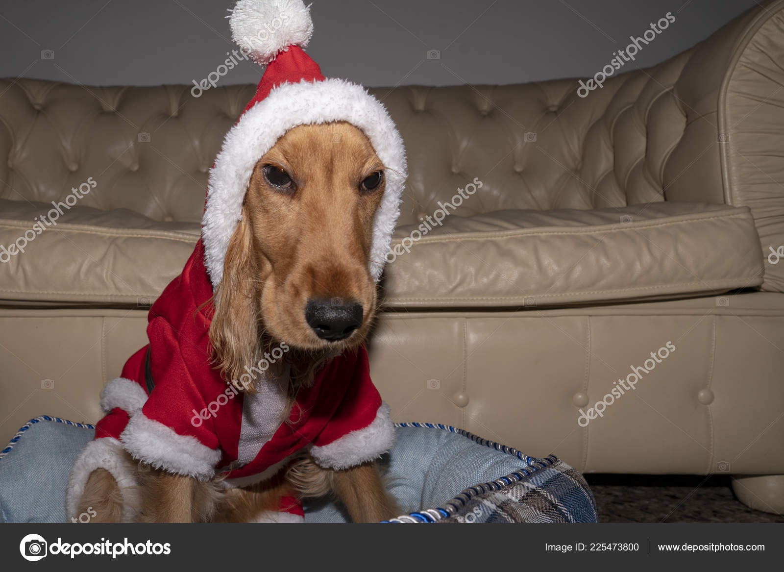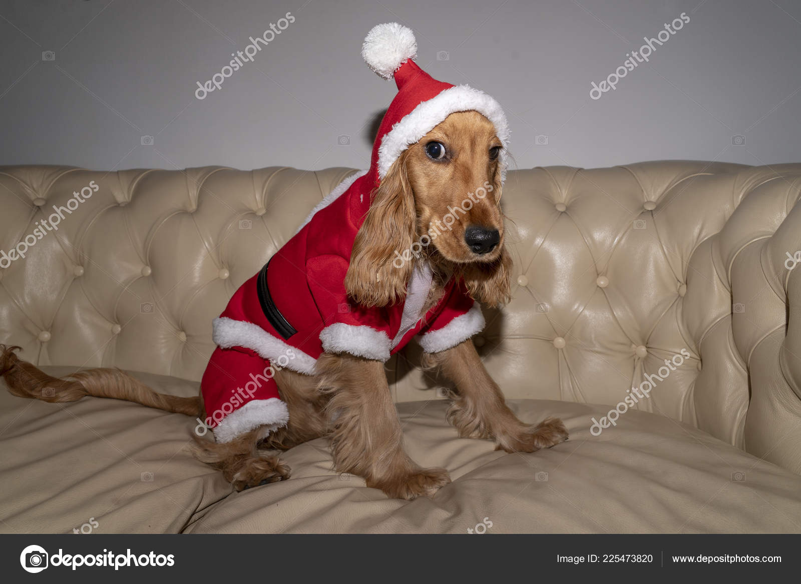 Santa Dressed Newborn Puppy Dog Christmas Stock Photo