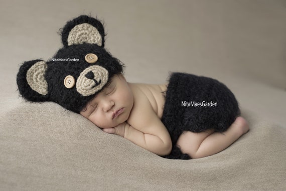 Black Bear Baby Hat Diaper Cover Set Preemie Newborn 0 3m 6m Crochet Photo Prop Baby Clothes Boy Girl Gender Neutral Halloween Costume