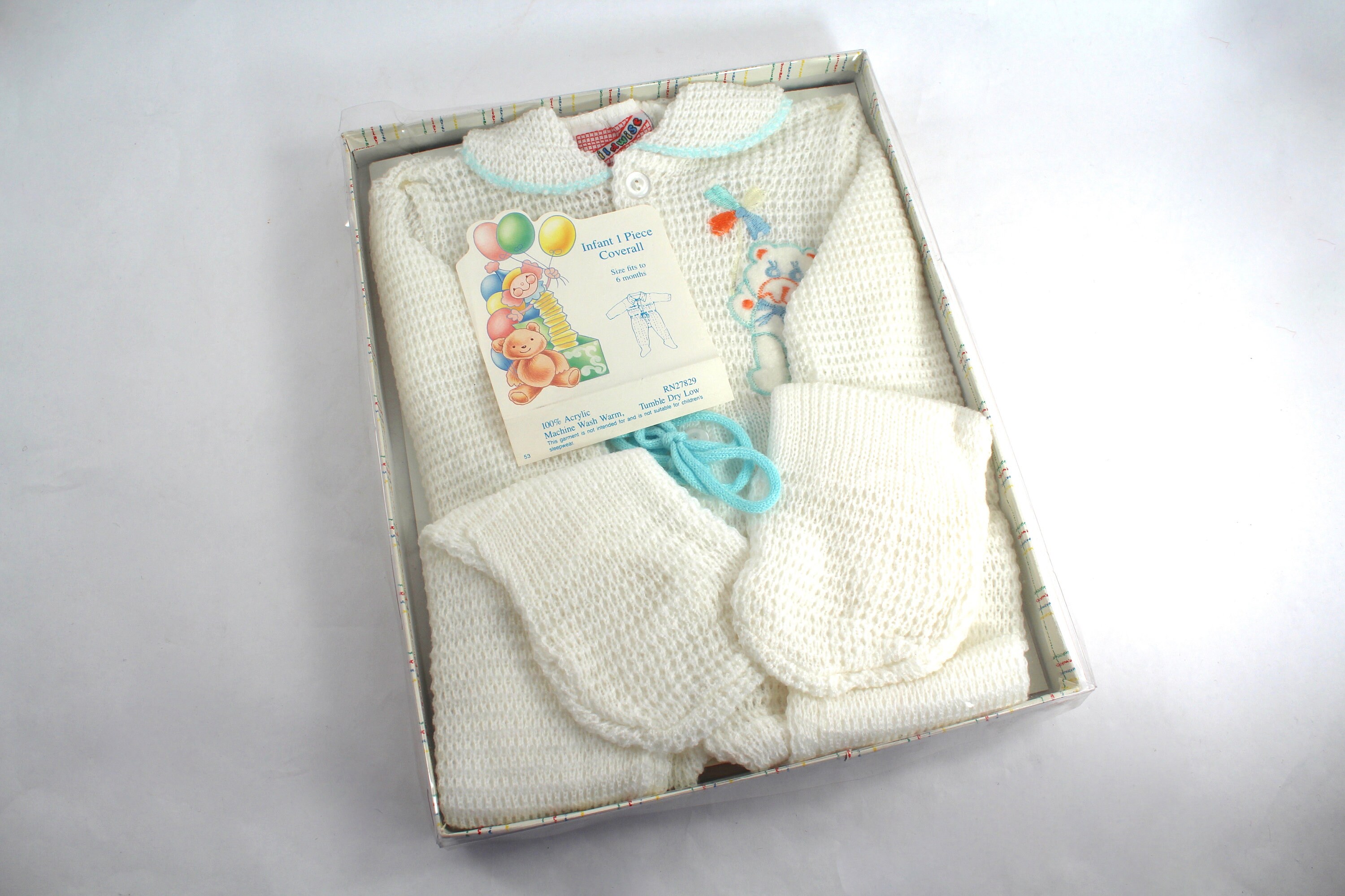 Vintage Newborn 6 Mos Baby Outfit Knit Coverall White Teddy Bear Crochet 1970s Or 80s 1980s 70s Baby Clothes Jumper