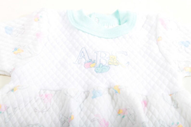 1980 S Abc Baby Sleep Suit Vintage Newborn Clothes Small Sized Doll Sized White Footed Abc Apples Bunny Blue Collar