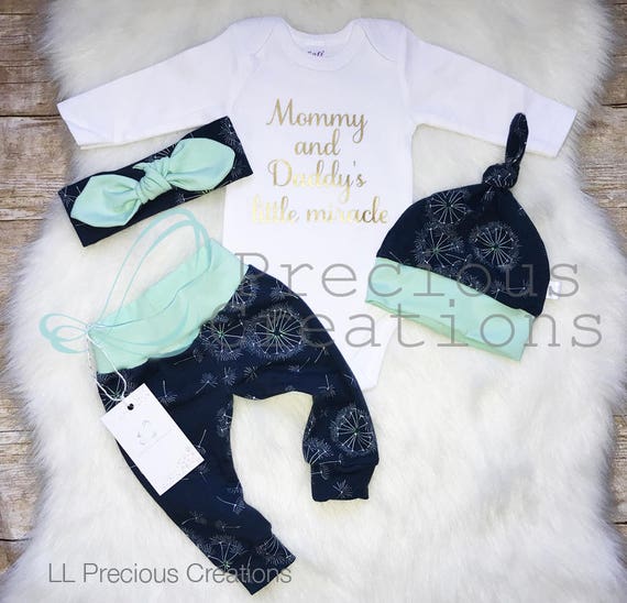 Ready To Ship Newborn Baby Girl Clothes Newborn Baby Girl Outfit Photo Prop Coming Home Outfit Mint Navy Dandelion Baby Shower Gift