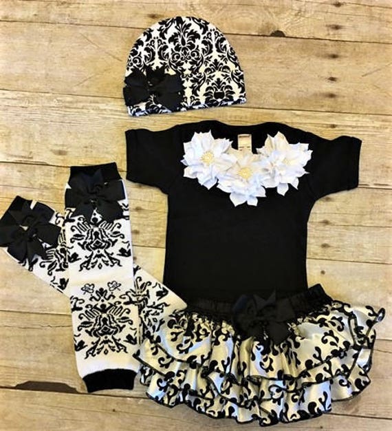Black Damask Outfit Baby Girl Damask Take Home Outfit Infant Girl Clothes Newborn Girl Couture Take Home Outfit Damask Baby Girl