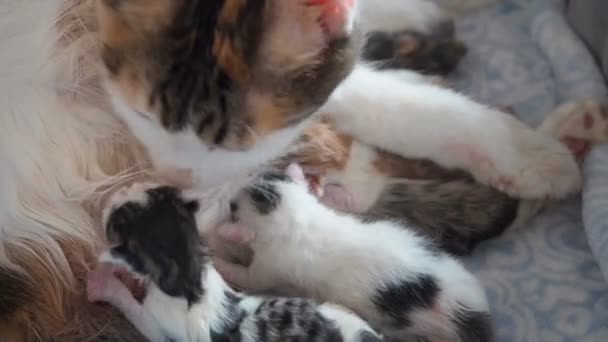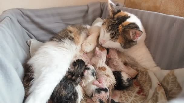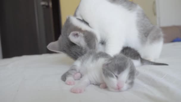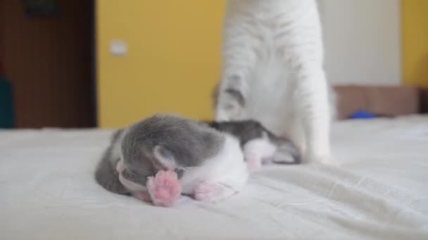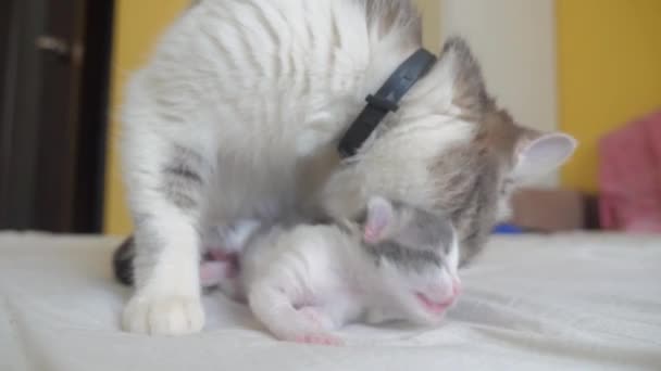 Mother Maine Coon Cat Licks Wet Newborn Kitten Stock Footage