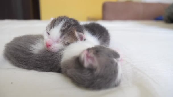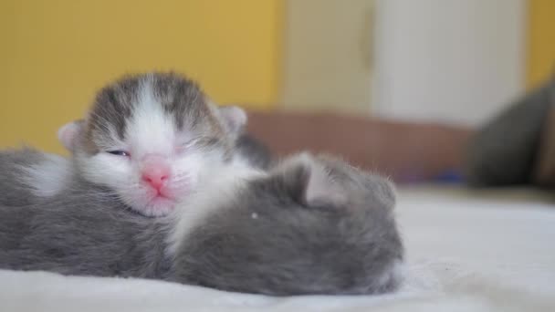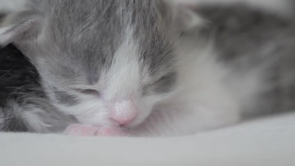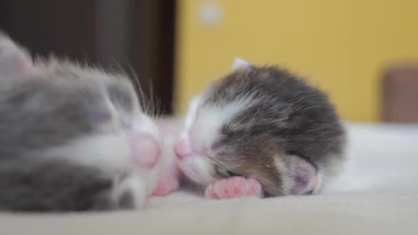 Funny Lifestyle Video Two Cute Newborn Kittens Sleep Teamwork On The Bed Pets Concept Pets Concept Little Cats Striped Sleep On A White Background