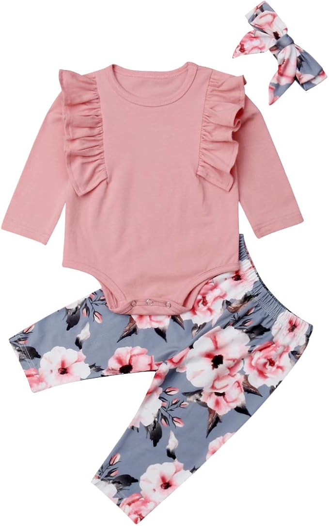 Newborn Baby Girl Floral Clothes Long Pants Outfits Short Sleeve Donuts Romper Bodysuit Headband