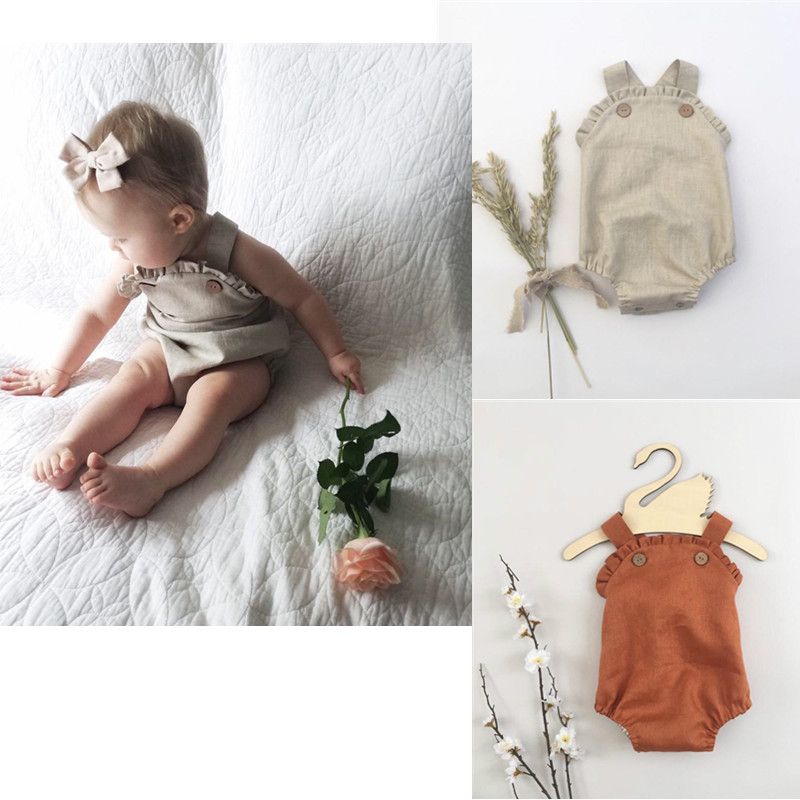 Ins Designer Baby Baby Girl Boy Romper Blank Button Organic Cotton Ruffles Collar Summer Linen Newborn Belt Jumpsuit Newborn Romper Onesies