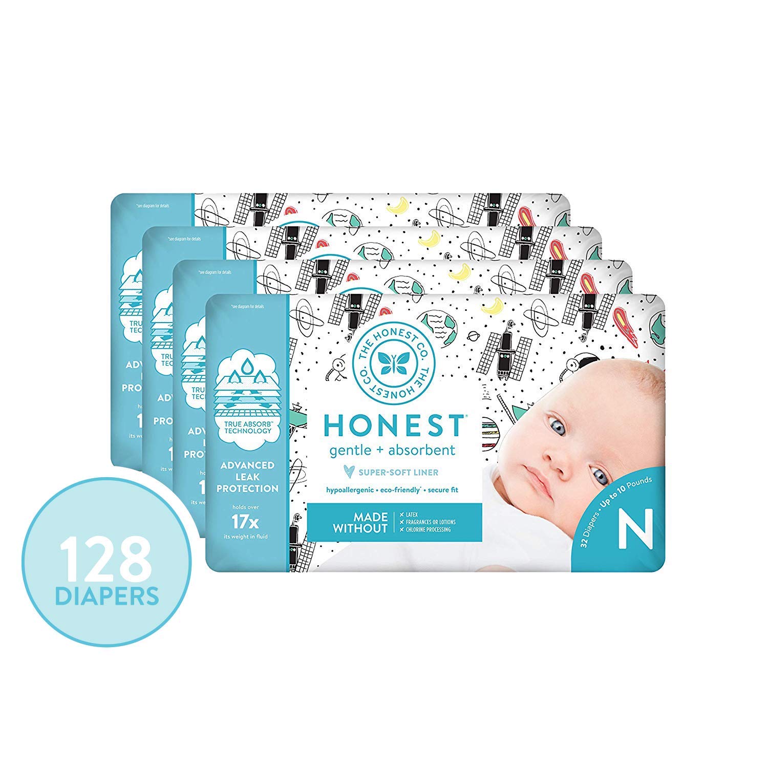The Honest Company Diapers Newborn Size 0 Space Travel Print Trueabsorb Technology Plant Derived Materials Hypoallergenic 128 Count
