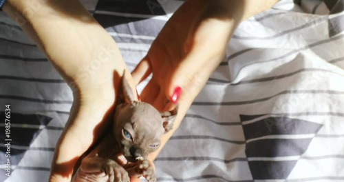 Women S Hands Holding A Newborn Kitten Of The Canadian Sphynx