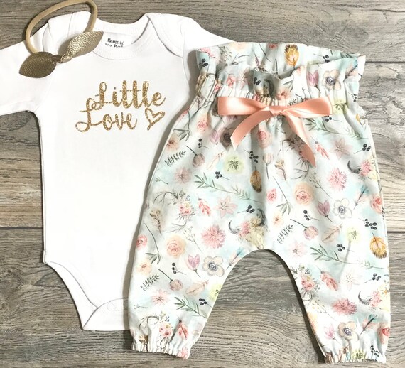 Newborn Coming Home Outfit Baby Girl Little Love Newborn Take Home Outfit Gold Glitter Bodysuit High Waisted Boho Bull Skull Pants