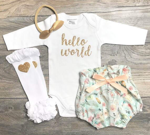 Hello World Newborn Take Home Outfit Bodysuit Boho High Waisted Bloomers Legwarmers Bow Coming Home Preemie Newborn Set Outfit