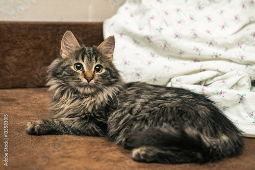 Cute Tabby Brown Kitten Lying And Looking Directly To Camera