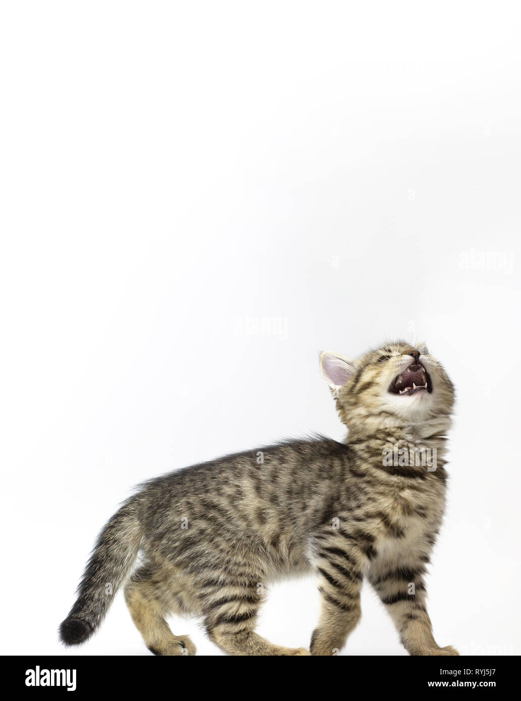 Cute Tabby Brown Kitten Standing And Meows Looking Up