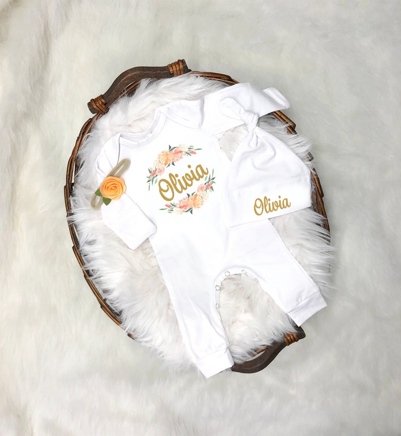 Floral Personalized Baby Girl Coming Home Outfit Newborn Girl Clothes Baby Romper Baby Shower Gift Set Newborn Peach Floral Swaddle Blanket