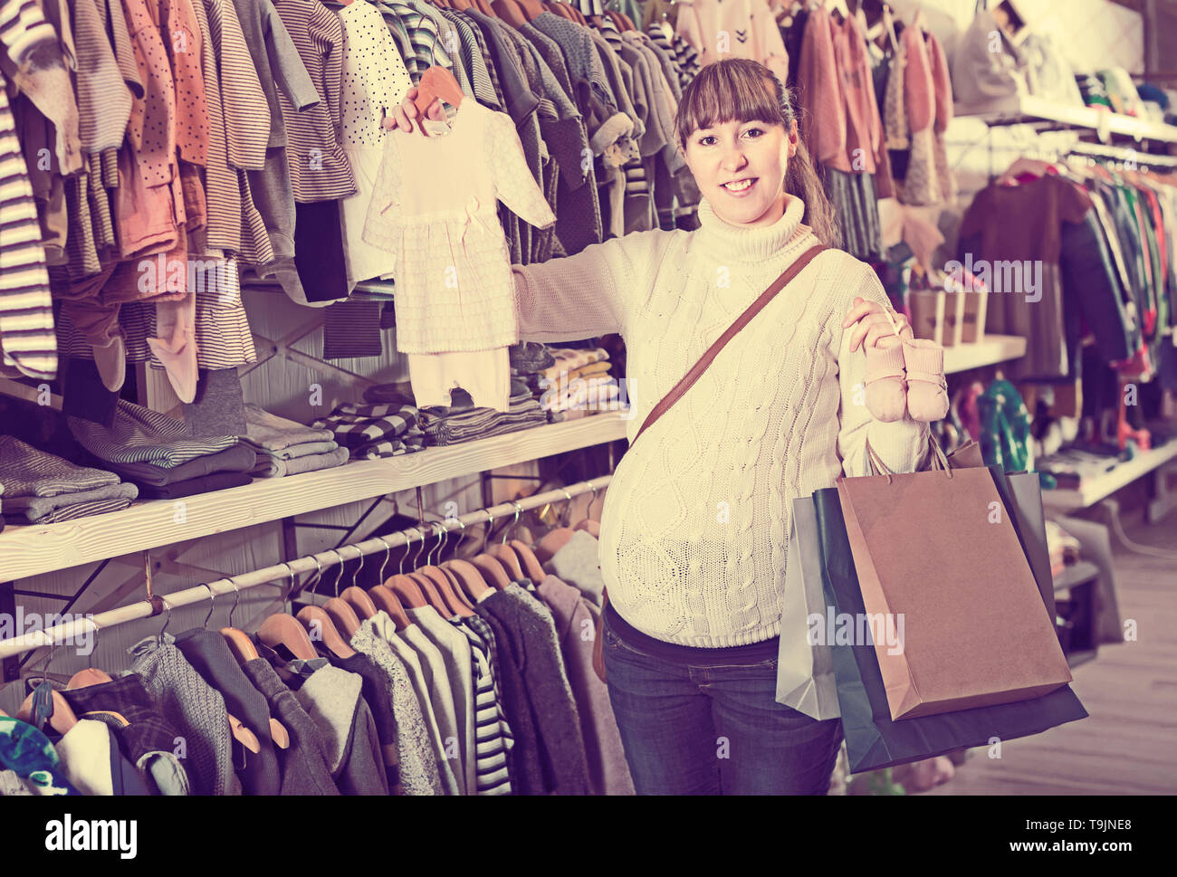 Pregnant Woman Choosing Newborn Clothes At Baby Shop Stock
