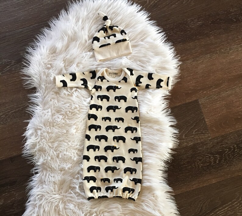 Newborn Elephant Coming Home Outfit Organic Baby Clothes Hipster Baby Clothes Gown Hat Elephant Black Cream Sparkle Going Home