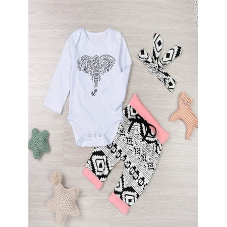 3pcs Set Newborn Baby Girl Boy Long Sleeve Elephant Bodysuit Geometric Pants Headband Outfit Clothes