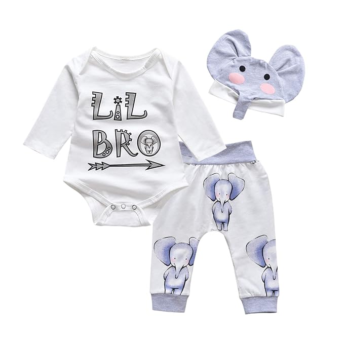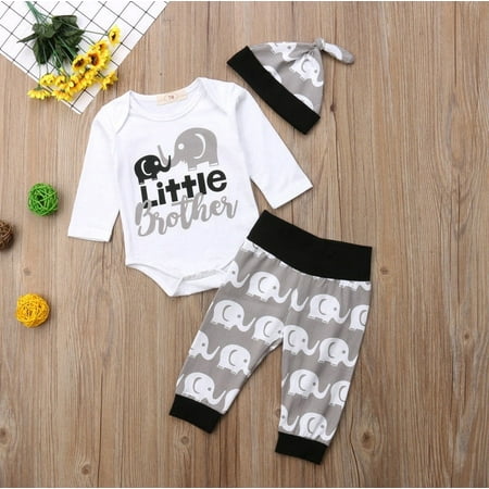 Newborn Baby Boy Clothes Little Brother Coming Home Outfit Cute Bodysuit Infant Leggings Elephant Hat 3pcs Outfits Set