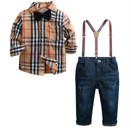 Baby Boy Clothes Autumn Spring Newborn Baby Sets Infant Clothing Gentleman Suit Plaid Shirt Bow Tie Suspend Trousers 2pcs Suits Epacket