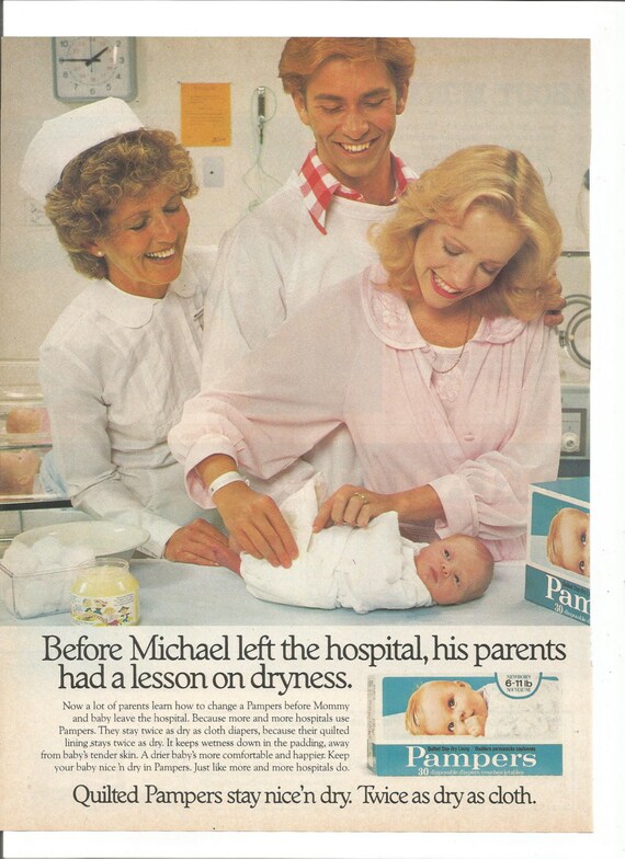 1982 Advertisement Pampers Diapers Newborn Baby Boy Nursery Unit Babies Hospital Doctors Nurses Parents Office Midwife Wall Art Decor
