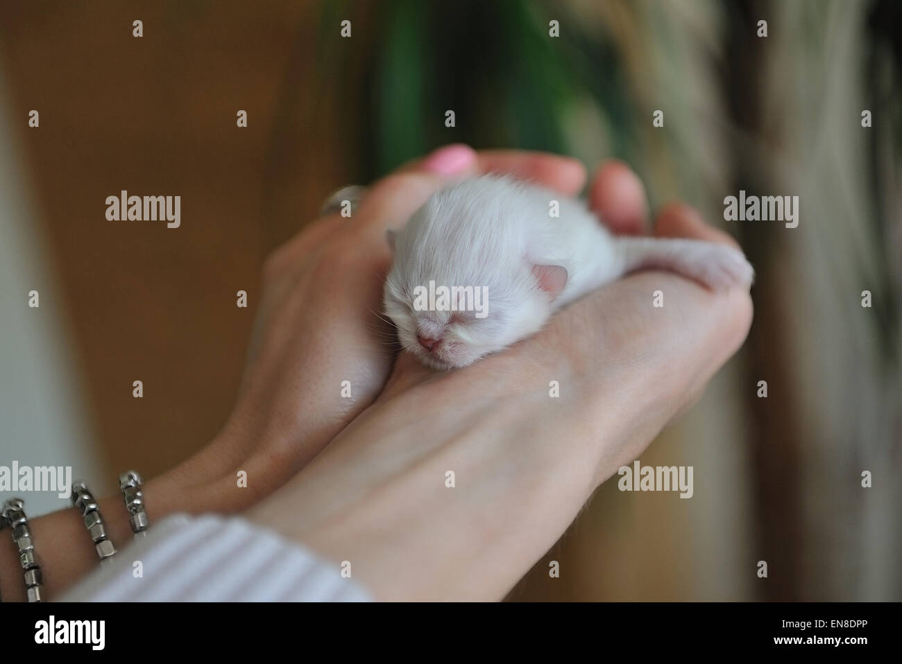 A Newborn Little Kitten With Eyes Closed In Female Hands