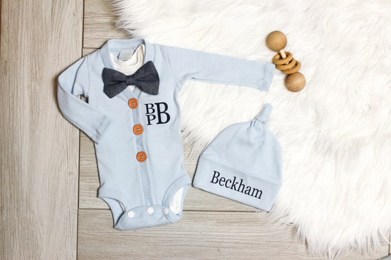 Newborn Boy Going Home Outfit Monogrammed Baby Boy Clothes Coming Home Outfit Blue Name Hat Personalized Cardigan