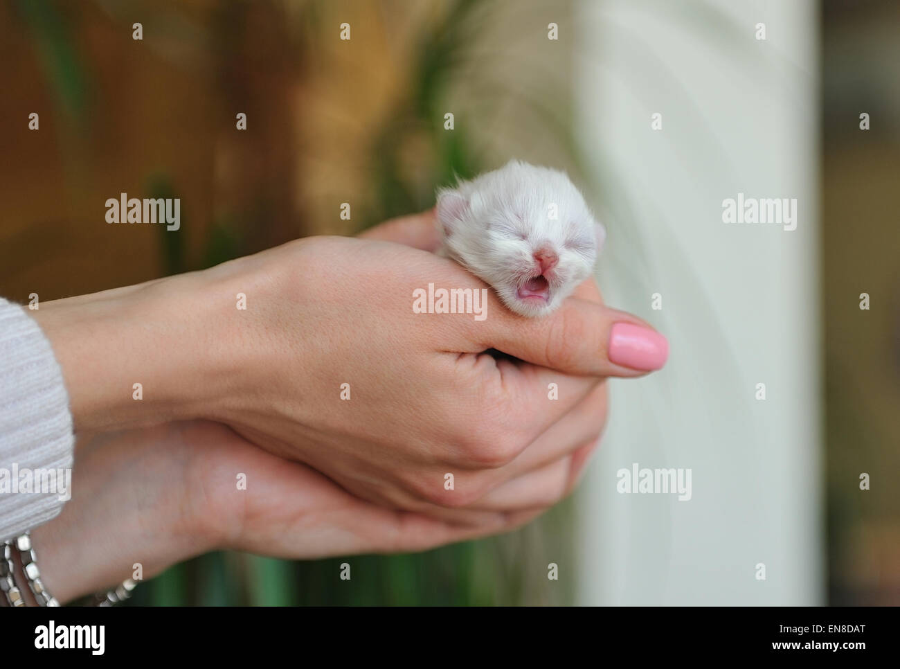 Newborn White Kitten In Female Nice Hands Stock Photo