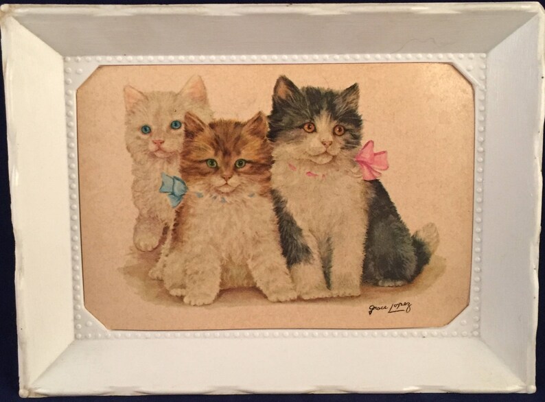 50s Kitten Picture Small Wall Hanging Grace Lopez 3 Kittens W Bows Lithograph Painting Shabby Kitties Art Print Baby Nursery Cat Decor Gift