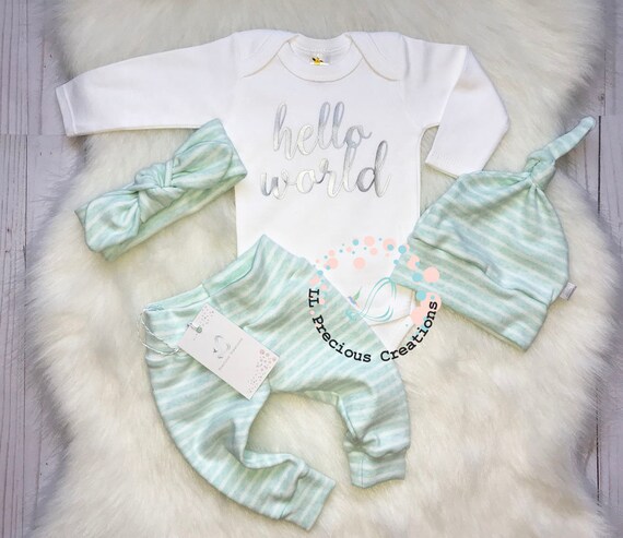 Hello World Baby Boy Outfit Coming Home Outfit Newborn Baby Girl Outfit Gender Neutral Newborn Boy Clothes Baby Shower Gift Mint Deer