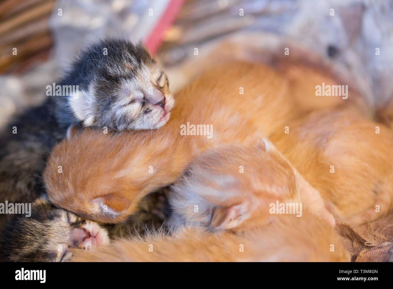 Germany Newborn Kittens Sleeping On Blanket Close Up Stock
