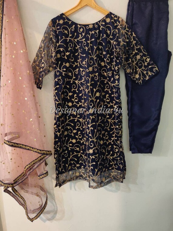 New Designer Dress Indian Pakistani Blue Embroidered Net Salwar Kameez Suit Party Wear Dress For Girls And Women