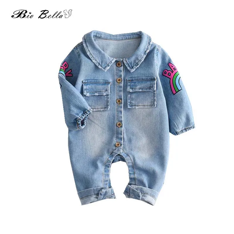 Us 7 99 30 Off New Baby Boy Clothes Fashion Blue Denim Long Sleeve Baby Rompers Newborn Animal Giraffe Rainbow Jumpsuits Roupas Bebes Costume In