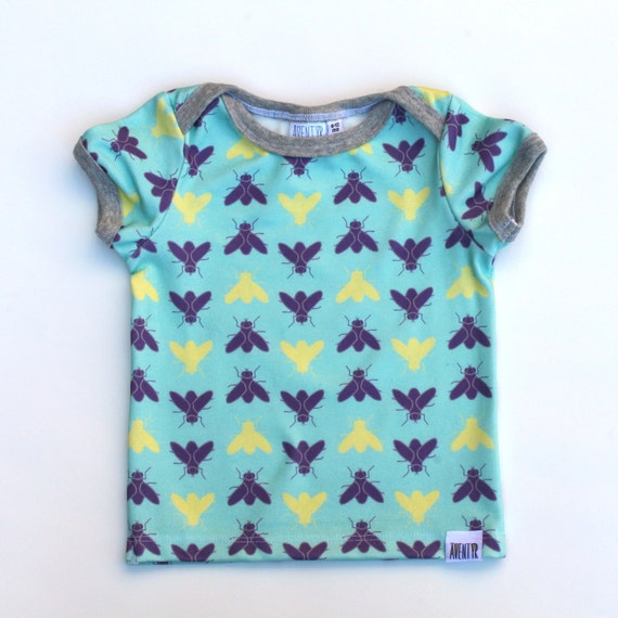 Organic Baby Shirt With Flies Newborn Clothes Baby Girl Top Baby Boy T Shirt Bugs Turquoise Tee Fly Infant Shirt With Lapped Shoulders