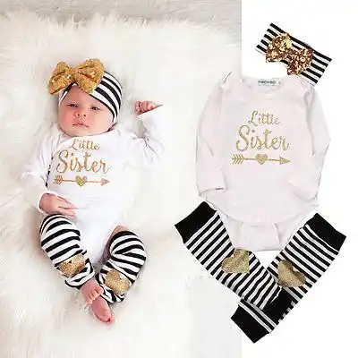 Little Sister Outfit Newborn Coming Home Outfit Baby Girl Gold Glitter Little Sister Bodysuit Black Striped Floral Pants Headband