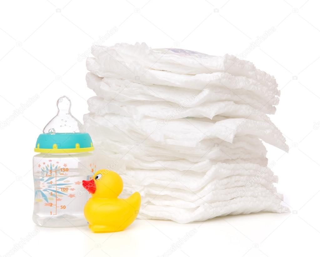 Stack Of Disposable Diapers And Toy Duck On White Background