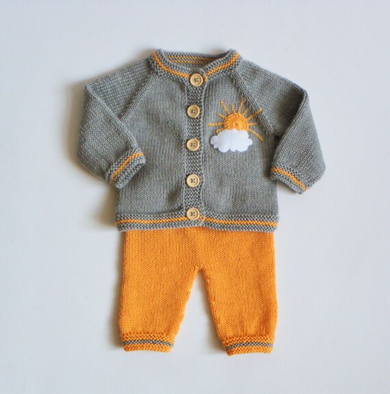 Knitted Baby Girl Outfit Grey And Yellow Set Knit Newborn Merino Set Merino Cardigan And Trousers Made To Order