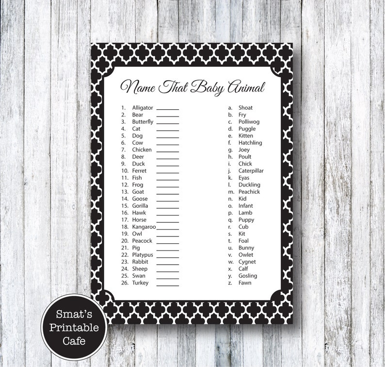 Black White Quatrefoil Baby Shower Baby Animal Name Game Quiz Printable Instant Download Baby Shower Games Neutral Baby Shower