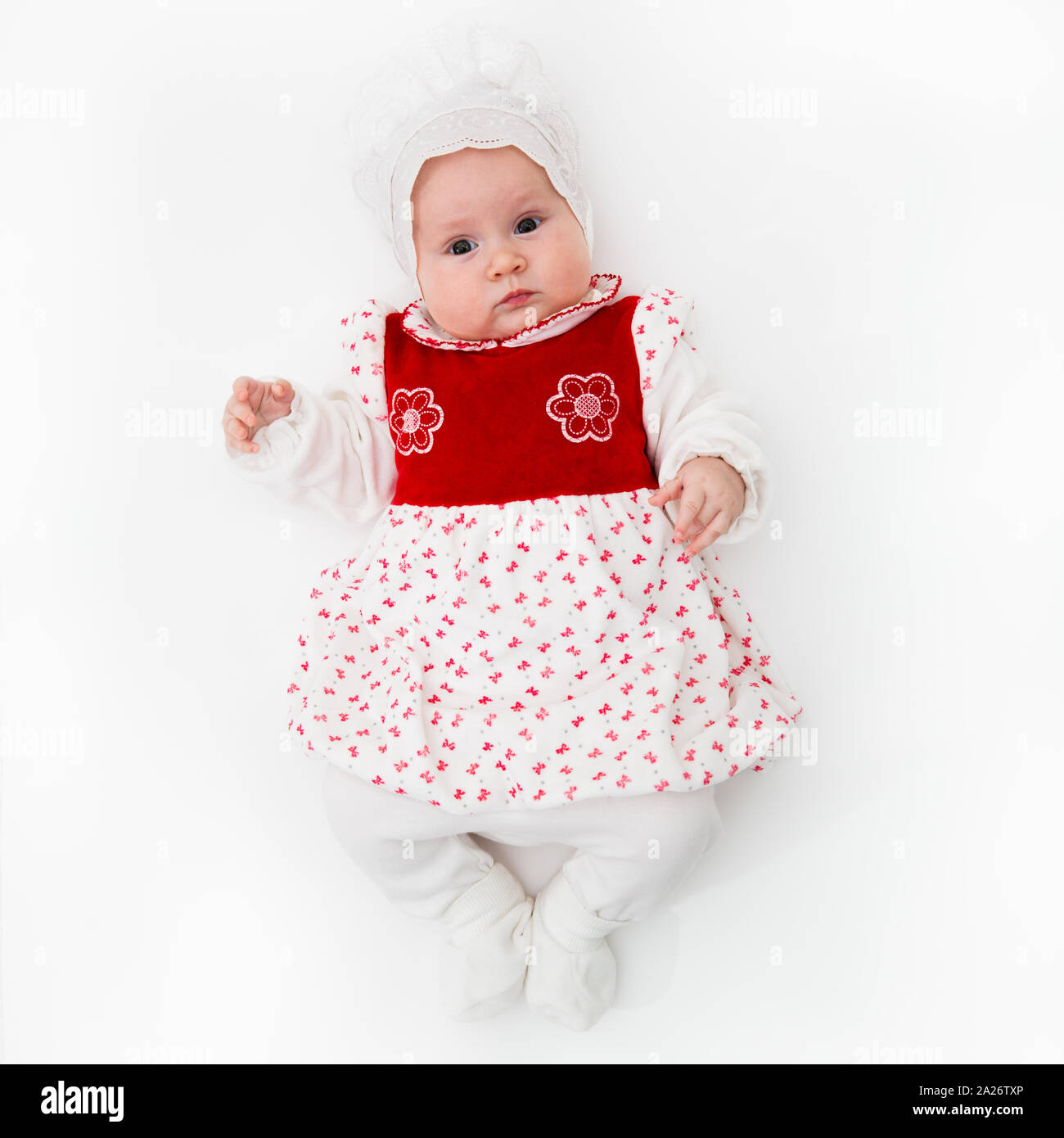 Caucasian White Newborn Baby Girl In A Pink Polka Dot Dress