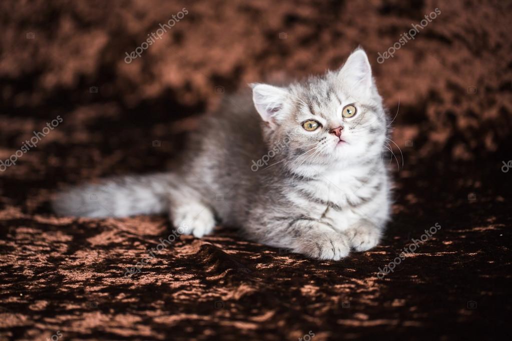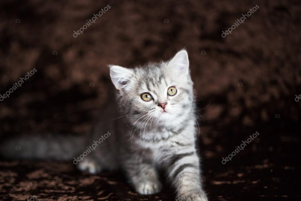 Small Brown Striped Fluffy Blue Eyed Kitten Sitting Among