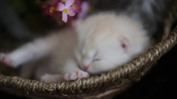 Classic Sleepy Newborn Kitten In A Basket With Various White