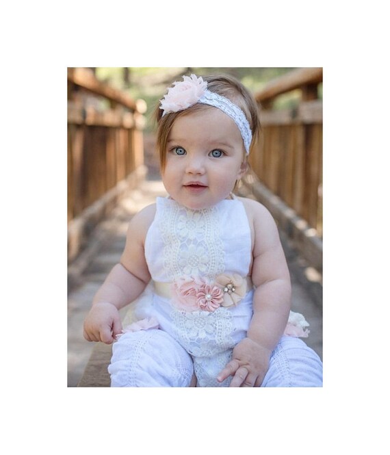 Summer Boho Chic White Lace Romper W Blush Sash Headband Newborn Baby Girl Coming Home Outfit 1st Birthday Easter Outfit Dress Mommy Me