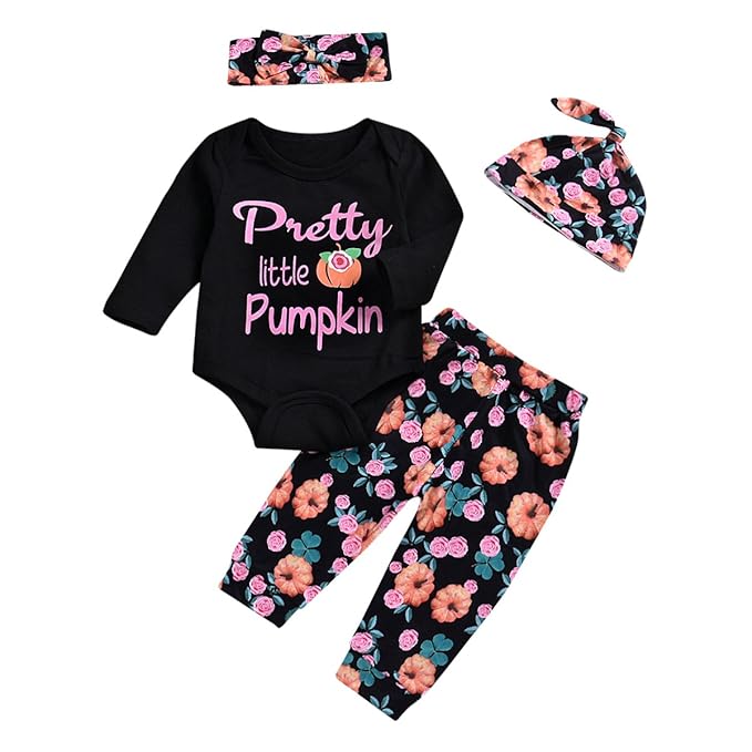 Newborn Baby Girl Pumpkin Halloween Outfit Romper Pant Hat Headband 4pcs Set