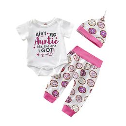 Newborn Baby Romper Set Infant Girls Funny Letter Romper Tops Kids Designer Outfits Clothing Set Elastic Donuts Pants Hat Three Piece Suit