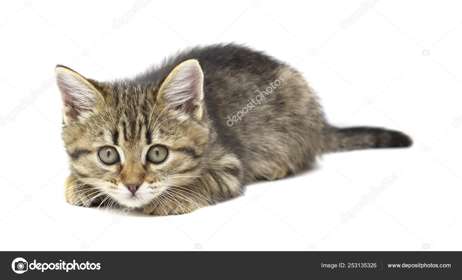 Cute Tabby Brown Kitten Lying And Looking Left Isolated On