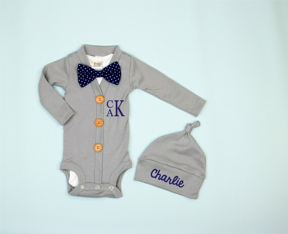 Monogrammed Baby Boy Clothes Newborn Boy Going Home Outfit Light Gray Cardigan Bodysuit Coming Home Outfit Grey Name Hat Personalized