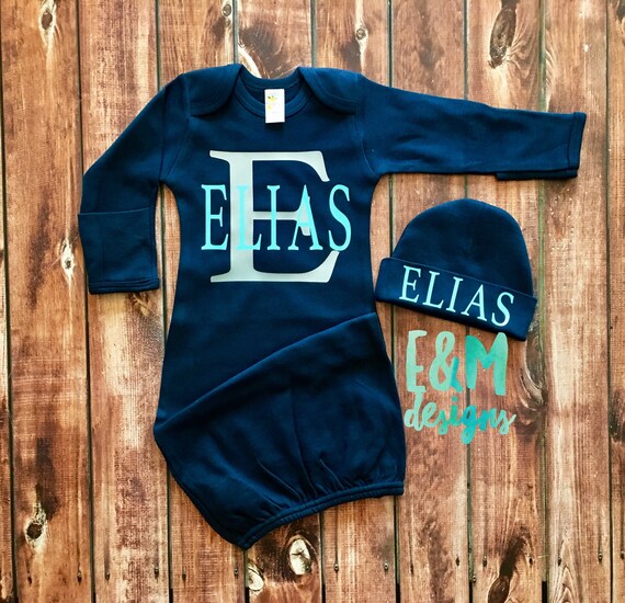 Baby Boy Coming Home Outfit Newborn Boy Monogrammed Gown And Hat Set Monogram Baby Boy Newborn Boy Outfit Monogram Navy Gown